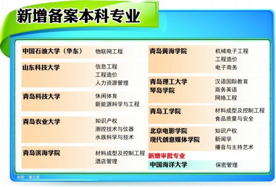 嬤|鬗膝雂F“2013年度普通坨校本科專業想案或審批鶞G”,一批坨校新增本科專業從2014年起開始招生。在青島的中國石油大(華東)10所坨校,新增本科專業23個,青島科技大的休閑體育專業、青島農業大的水族科與技術專業,ㄛO挺新鮮的專業。【更多】
