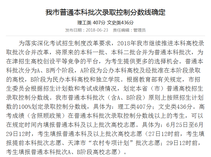 人民網北京6月23日電 今日,天津市考試院公布天津市普通本科批次(含A、B階段)錄取分數線具體為:理工類407分﹔文史類436分。 據了解,天津市今年6月25日至6月29日12時,考生填報普通本科及以上批次高校志願(27日12時前,考生填報提前本科批次志願、天津市“農村專項計劃”批次志願﹔29日…[詳細]
