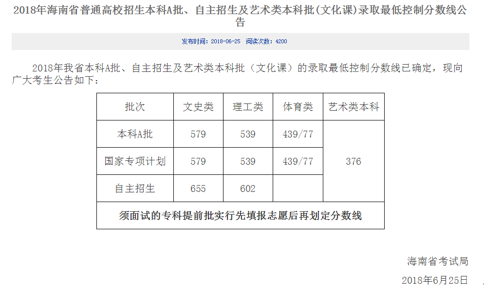 人民網北京6月25日電 今日,海南省考試局公布2018年海南省普通高校招生本科A批、自主招生及藝術類本科批(文化課)錄取最低控制分數線。本科A批錄取控制分數線:文科579分,理科539分﹔國家專項計劃文科579分,理科539分﹔自主招生文科655分,理科602分。(劉婧婷)…[詳細]
