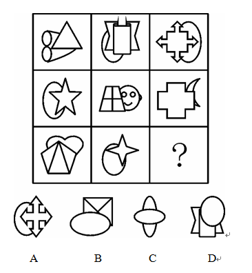 【析】這道題考查的是曲直性。直踇通過題干並不能十分直觀的分析出規律,但同時觀選項就會發現每一個圖形ㄛO由兩個小圖形成,成比較相似,而且BCD三個選項都有一個橢圓╪b另一個圖形上方,再看題干會發現給出的八個圖形ㄛO直線圖形6萓掃u圖形,而選項中隻有A選項符合這個條件,所以選擇A選項。