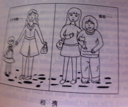 As is vividly described in the left part of the drawing, thirty years ago, there stood a delicate mother, holding the tiny hand of a lovely girl, who wore a red scarf. On the contrary, the right part of the picture illustrates that with time flying quickly, the little girl, who has already grown up as a gorgeous lady, is supporting her old mother. We are informed: accompanying.