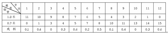 由上表看出,方法3和方法10沒有殘料,如果能把這兩掔方法配合起來,使截出的甲、乙兩掔管子量相峞A那麼就是殘料最少的方案了。
