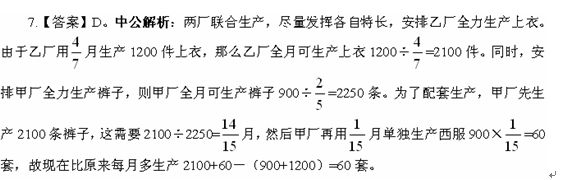 2.【答案】C。析:顯然A廠每天能生產上衣8640÷12=720件,運動8640÷18=480件﹔B廠每天生產上衣6720÷16=420件,運動6720÷14=480件。顯然讓B廠全力生產運動丑A一個月能生產14400件﹔A廠用14400÷720=20天生˙P之配套的上衣,剩下10天,A廠按2:3的天比例生產上衣與運動丰H保配套,則生產4×720=2880套,A、B兩廠共生產14400+2880=17280套。