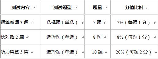 1. 取消短對話,2. 取消短文聽寫,3. 新增短篇新聞(3段)。其余測試內容不變。調整后四級聽力部分的試題結構見下表: