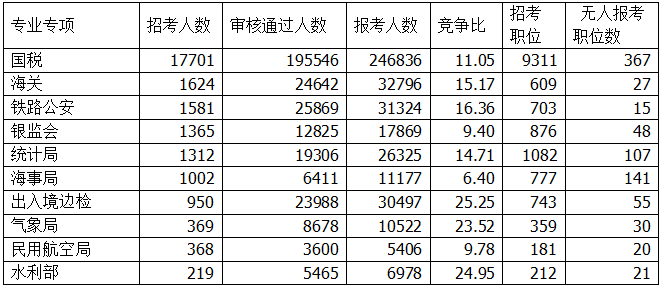 國稅是招錄大戶,目前共有19萬人通過審核,共有24萬人報名,競爭比為11:1,仍有367個職位無人報考。鐵路公安審核通過人數位居第二,目前有2.5萬人通過審核,競爭比為16:1。值得關注的是,國家物資儲備局雖然招錄人數不是很高,僅有51人,但目前有4236人報名,3554人通過審核,競爭比高達70:1。