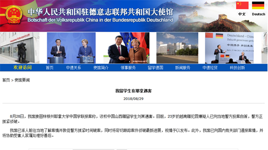 中國駐德國大使館發布消息稱,已派人前往當地了解案情並敦促警方抓緊時間破案,同時將密切跟蹤案件偵破最新進展,視情予以發布。此外,中國駐德國大使館已向國內有關部門通報案情,並將協助受害人家屬處理好善后。