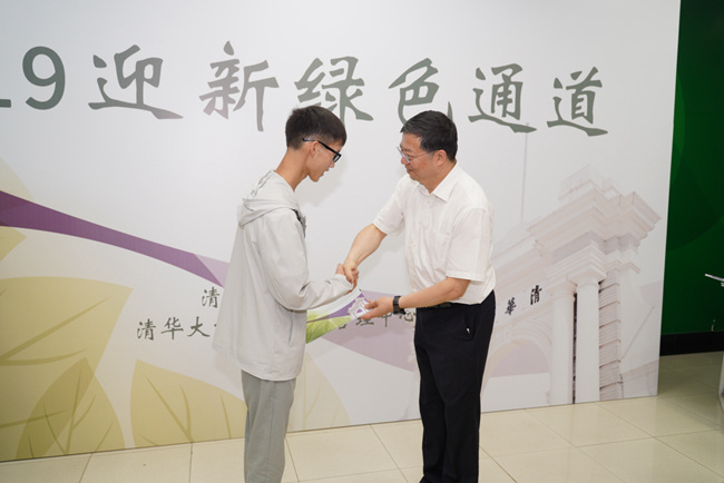 前來看望新生的清華大學校長邱勇在綠色通道現場向正在辦理手續的同學們贈送了學校精心準備的“綠色通道愛心大禮包”,禮包內包括教材卡、自行車卡、通訊卡、游泳卡、超市卡、理發卡、觀演卡和鴻雁卡等,覆蓋了校園生活中學習、體育鍛煉、生活的方方面面。
