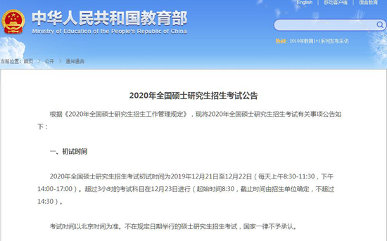 人民網北京8月19日電 (記者 郝孟佳 實習生 黃鈺霖)今天,教育部網站發布了《2020年全國碩士研究生招生考試公告》。公告確定,2020年全國碩士研究生招生考試網上報名時間為2019年10月10日至10月31日(每天9:00-22:00)。初試時間為2019年12月21日至12月22日(每天上午8:30-11:30,下午14:00-17:00)。