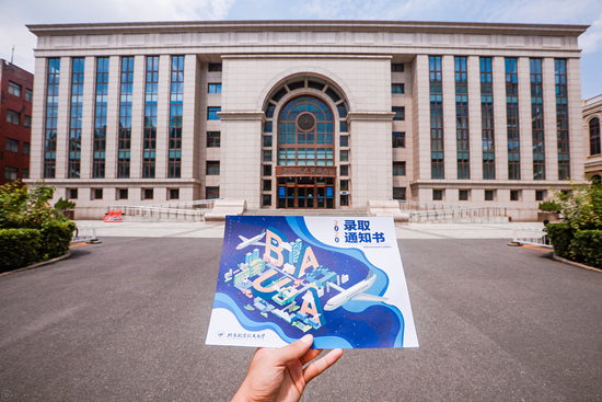 “北航定制”版的EMS郵寄包,封面設計為排列成北斗七星形狀的7架飛機。今年的錄取通知書由北航新媒體藝術與設計學院學子房方自主設計,採用充滿空間感的趣味創意,將BUAA與校園建筑融合,並加入飛機與“航概妹”等北航特色元素。此外,通知書大禮包內還包含一張火星車征名邀請函,特別邀請新生為中國第一輛火星車命名,由此開啟新生的第一份航空航天“事業”。