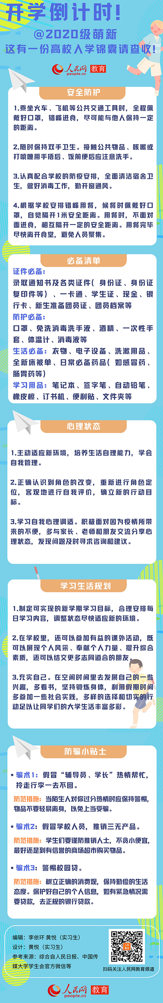 人民網北京8月19日電(李依環 實習生黃悅)當前,全國多地高校已經陸續公布秋季開學時間,大學校園即將迎來“萌新”報到。人民網教育頻道特別梳理了一份入學錦囊,請即將步入新階段的學子們查收,元氣滿滿開啟大學校園生活。