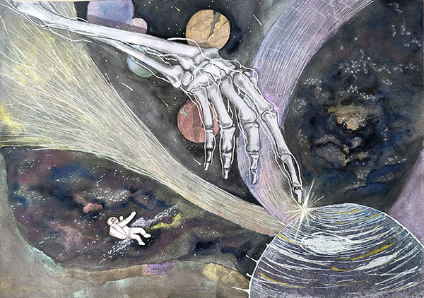 作者劉介清解讀:畫面主體為解剖學上的手骨與手部神經部分。延伸的手骨代表著人類的渴望,神經代表著每個人的內在驅動和外在感知,而星辰代表著未來的光明與未知。作品表達人類在歷史發展過程中始終持有對知識的渴求、以及與未知事物的探索。