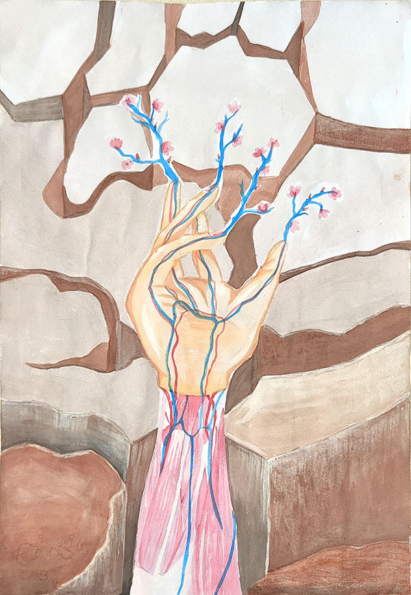 作者毛雨菲解讀:畫面中一片大地上,一隻筋肉強健的手緩緩托舉起希望,靜脈和動脈交纏著從指尖開出一片海棠之花。這幅畫意味著天津大學首次設立醫學專業,第一次綻放出了新醫科的花朵。這隻以靜脈動脈澆灌而成的海棠花將會在北洋學府的大地上以最熱烈的姿態向陽生長。