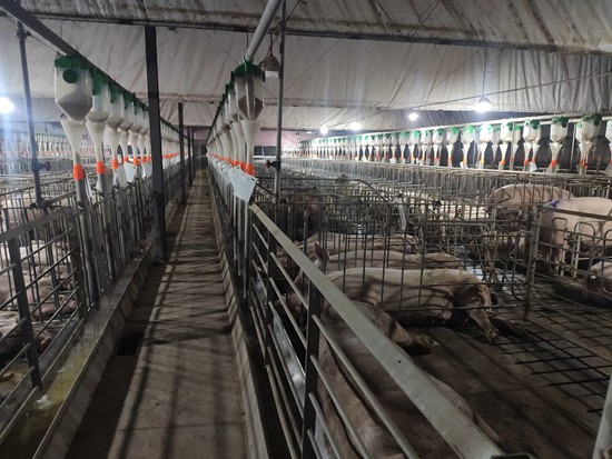 這些母豬終生都不會有自然交配的機會。每間配懷舍都有兩三頭公豬,它們高大威猛、唾液多、腥味重,但是母豬們隻能看看。