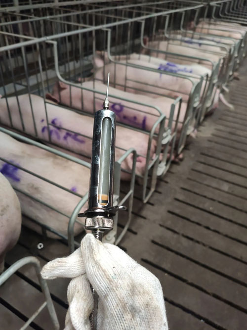 騎豬是在配懷舍工作的必備技能,李迪要模擬公豬的動作對母豬進行騎跨。確定母豬發情后,他把從公豬站拿來的袋裝公豬精液輸送到母豬生殖道內,就完成了人工授精。