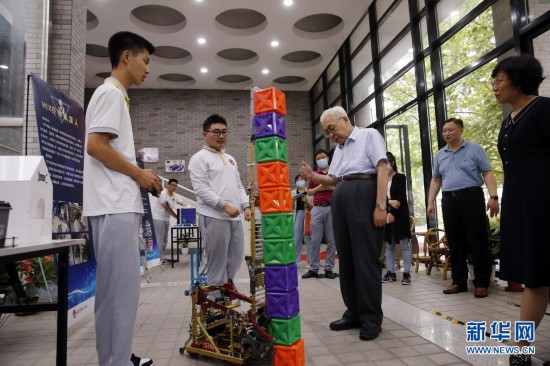 當日,中國科學院院士、中國月球探測工程首任首席科學家歐陽自遠走進北京二中教育集團為師生做了“向太陽系的星辰大海挺進”主題演講,並觀摩了學生的科技作品。新華社發(周良 攝)