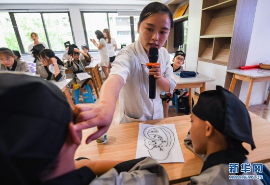 7月14日,在成都市武侯區竹園社區,志願者為小朋友講解耳穴圖。