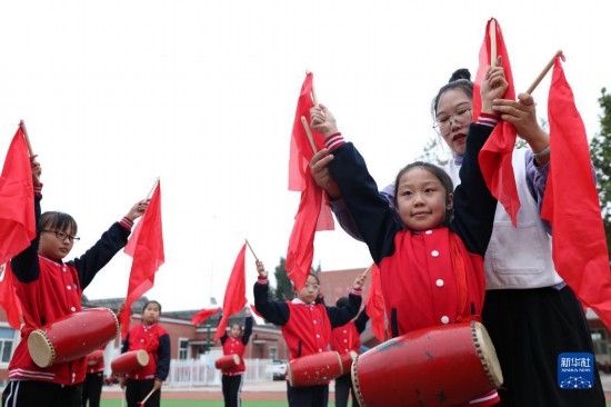 10月8日,河北省邢臺市任澤區達二小學老師在指導學生練習打腰鼓。