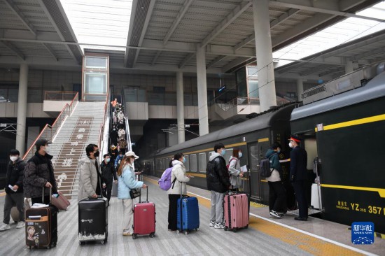 1月17日,旅客在西安站排隊乘車。新華社記者 李一博 攝