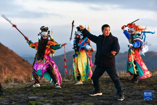 2月7日,龍裡太平花燈戲藝人劉江(前)在村子附近的山頂上指導年輕人練習花燈戲。