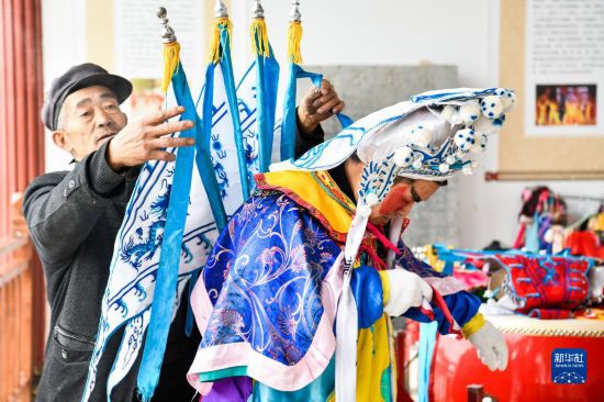 2月6日,龍裡太平花燈戲藝人趙應明(左)在給戲班成員整理行頭。