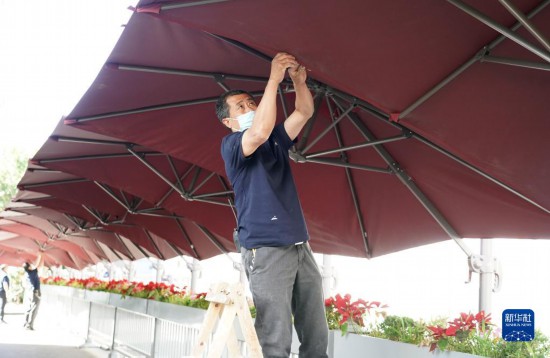 6月5日,在中國農業大學附屬中學考點,工作人員架設防雨棚。