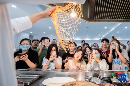 9月9日,鄒志平在《中國名菜鑒賞》課堂上向同學們展示用胡蘿卜制作的網。