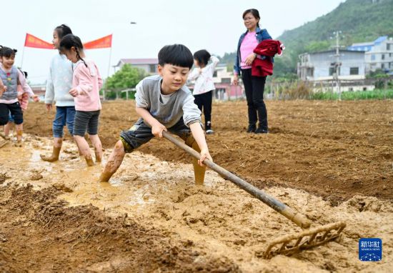 4月1日,在柳江區進德鎮龍新村龍朝屯,小朋友在家長陪同下體驗平整土地。