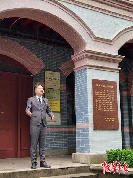“聽!中山先生在思顏堂演講呢!”“快去,快去!”5月5日的華東政法大學長寧校區校園裡,行人很有可能被一群穿著民國學生裝的年輕人“拉”到孫中山先生1913年2月1日的演講處——華東政法大學40號樓禮堂門前,一起聆聽110年前的孫中山演講。這裡正在進行的,是華東政法大學“蘇河明珠”實景思政課,為大家“上課”的是大學生和思政教師。學生們在百年歷史建筑前上演了一幕幕經典橋段,思政教師則負責在每一個橋段結束后串場介紹。