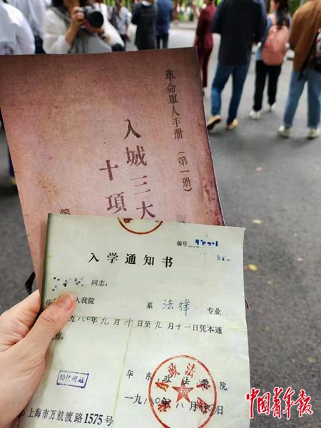 從孫中山演講地到解放軍宿營地,從上海解放前夕犧牲的最后一位中共地下黨員,到大草坪搭帳篷把辦公樓留給新生用的校領導,華政校園裡“全是戲”。同學們一邊在校園裡演出,一邊移步換景,切換場景的過程中,還不忘給觀眾發放一張華政錄取通知書、一份寫了解放軍入城三大紀律的革命軍人手冊等。