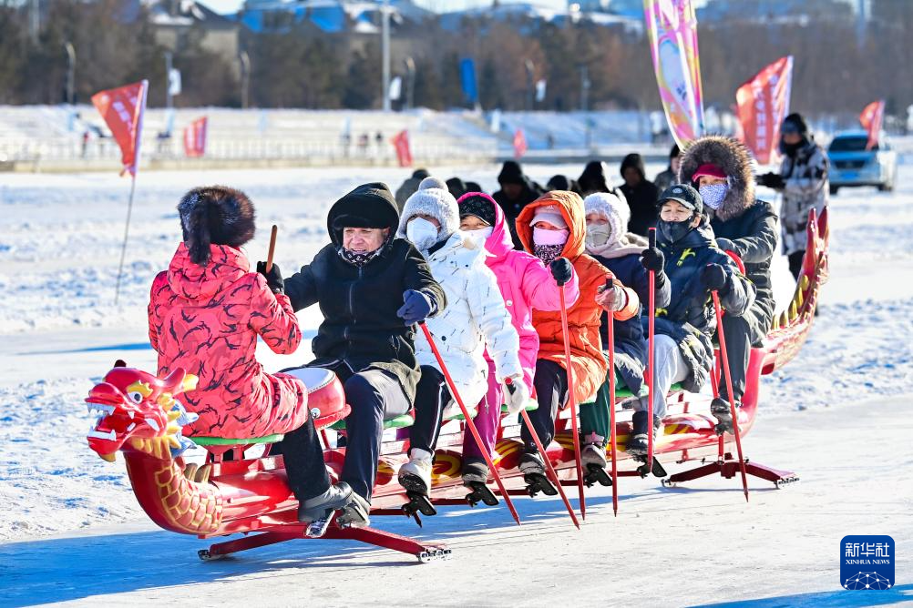 12月21日,人們在內蒙古呼倫貝爾的城市越野滑雪公園參加冰上龍舟比賽。