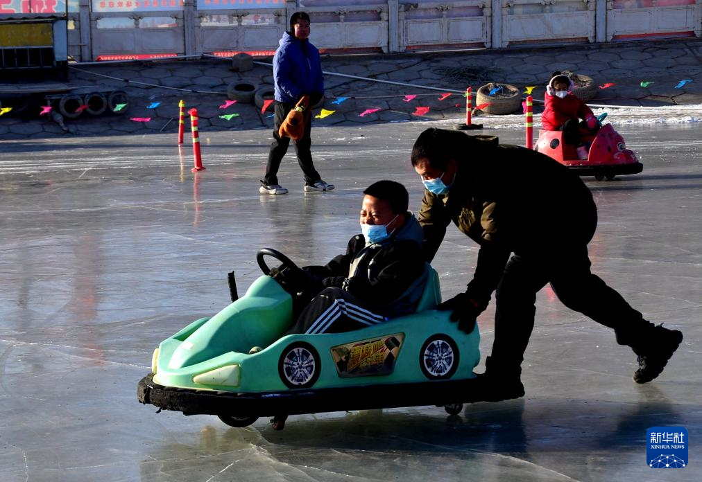 12月21日,人們在甘肅省酒泉市肅州區錦玉公園滑冰場嬉戲。