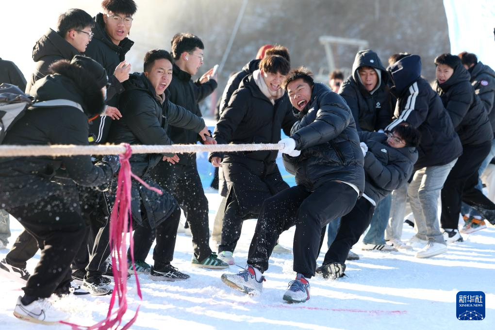 12月21日,在河北省石家莊市鹿泉區冰雪小鎮,大學生進行雪地拔河比賽。
