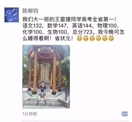 浙江新高考各類別各段分數線及考生成績昨晚揭曉。 到底是何方神圣,拿到2017年浙江新高考的最高分? 答案就是他!來自諸暨中學高三(1)班的王雷捷同學,他以總分723分(滿分750分),位次號列全省第一。 班主任陳柳鈞的朋友圈 圍觀一下,他的高考成績單: …[詳細]