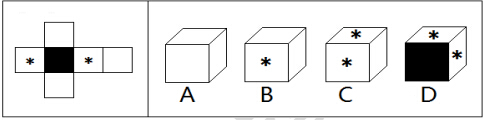 【解析】B 圖形折疊。觀察左側圖形可知,三個空白面中有一對空白面為相對面,不可能相鄰,因此A項錯誤,排除A﹔兩個含有星星圖案的面為相對面,不可能相鄰,排除CD項﹔B項可以由左側圖形折疊而成。故選B。