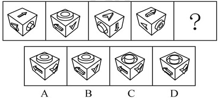 【解析】C 立體圖形。題干給出的幾幅圖形均為一個立體圖形從某一角度看到的三個面,並且每一個圖形所呈現的角度均不相同。其中奇數項圖形含有的三個面是相同的,只是面的放置位置不同,偶數項圖形具有相同的規律。因此“?”處的立體圖形應該與圖形1和圖形3的三個面相同,隻有C項符合。故選C。