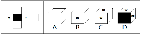 【解析】B 圖形折疊。觀察左側圖形可知,三個空白面中有一對空白面為相對面,不可能相鄰,因此A項錯誤,排除A﹔兩個含有星星圖案的面為相對面,不可能相鄰,排除CD項﹔B項可以由左側圖形折疊而成。故選B。