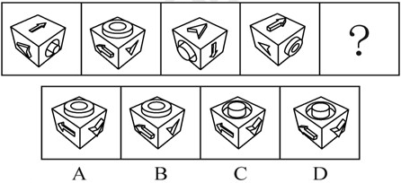 【解析】C 立體圖形。題干給出的幾幅圖形均為一個立體圖形從某一角度看到的三個面,並且每一個圖形所呈現的角度均不相同。其中奇數項圖形含有的三個面是相同的,只是面的放置位置不同,偶數項圖形具有相同的規律。因此“?”處的立體圖形應該與圖形1和圖形3的三個面相同,隻有C項符合。故選C。