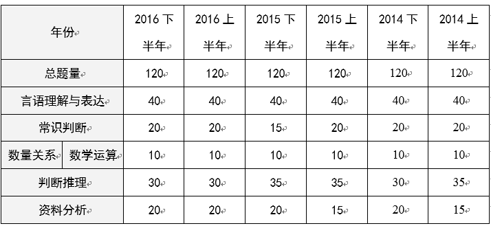 資料分析題目的題量,2016下半年為20道,2016上半年為20道。主要包括文字型、圖形型、綜合型等,最近考試經??季C合型的題目,也就是文字和圖形、文字和表格、表格和圖形綜合起來考查。重點考查增長率、增長量、比重和倍數等概念,要求考生具備快速查找數據、列式並進行準確計算的能力。