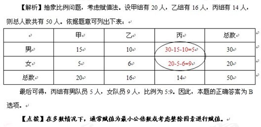 【例5】某調查隊男女隊員的人數比是3:2,分為甲乙丙三個調查小組。已知甲乙丙三組的人數比是10:8:7,甲組中男女隊員的人數比是3:1,乙組中男女隊員的人數比是5:3,則丙組中男女隊員的人數比是:( )