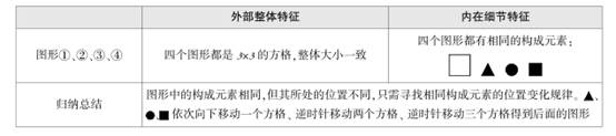 辨別圖形主要從兩個角度進行:一是“異中求同”,即當一組圖形的構成元素差別很大時,則分析這組圖形“內在細節特征”上的共同點;二是“同中求異”,即當一組圖形的構成元素完全相同或極為相似時,則分析圖形之中相同構成元素之間的轉化方式。