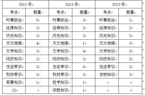對于常識的復習,首先要知道國考具體涉及到的內容有哪幾部分。這就需要對近幾年的常識題進行分析歸類,近三年的常識類考試的題型,考生可以參考下表: