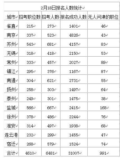 2014年江蘇公務員招錄考試報名已經于2月15日上午9:00正式開始,根據統計結果顯示,截止2月18日下午16:00,報名成功人數共計31007人,仍然有991個職位無人問津。2014年江蘇公務員考試計劃提供4610個職位,招錄6480人。中公教育專家提醒考生,報名高峰即將到來,還未報名的考生盡快下手。