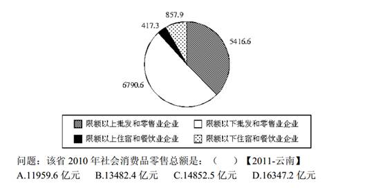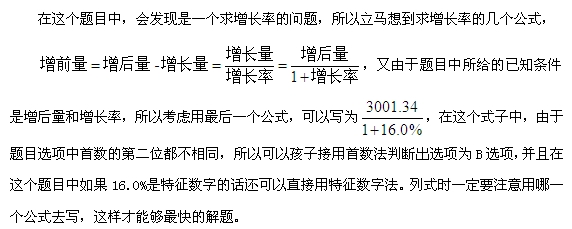 在這個題目中,大家都應該知道是所有在餅狀圖中的數據想加就可以了,但是如果要將所有的數據都寫出來的話就會浪費很多時間,所以現在就要充分的利用運算的技巧和列式的技巧。如果熟悉運算技巧的話,本題應該立刻想到要用尾數法,又因為題目選項中的尾數末一位都不同,所以只需要取所需要數據的末一位就可以了,就可以將6790.6+417.3+857.9+5416.6變為6+3+9+6=24,尾數為4,可以直接口算。