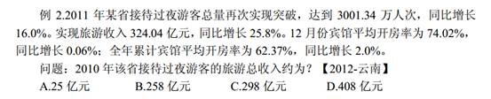 資料分析看似一個非常復雜的東西,但是實際上,資料分析往往具有可準備性。在備戰中都有一句話叫做千軍萬馬過獨木橋,看誰狠誰就能過去。所以說合理的準備會讓自己更容易成功。資料分析主要分為兩大部分,一個是列式,另外一個是速算,對于列式來講并不算很難,主要是要提升計算速度和準確度。對于普通的列式,主要要掌握最基本的公式,并且要做到列為自己最熟悉的運算形式,這樣才方便計算,并且在整個解題的過程中該寫的部分就寫,不該寫的部分就不用寫,這樣的話就能夠節約時間。對于速算,就是要掌握最基本的運算技巧和巧算、估算方法。這樣結合起來就能提升資料分析的做題速度和準確度。主要以下面的幾個例子為例。