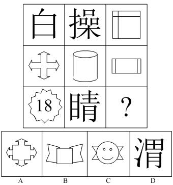 這幅圖形較為復雜,包括漢字、數字和平面圖形。但是總體上呈現為九宮圖形。所以同學們在做題的時候,首先運用九宮圖形的做題思路,先橫向看?吹綕h字,我們首先考慮筆畫,但是看第一行,很明顯不是考查筆畫。這就需要我們從漢字中抽離出來,整體觀察該圖!鞍住弊,明顯有兩個封閉區間,“操”字有三個。第一行最右邊圖形有四個封閉區間,呈現遞增趨勢。