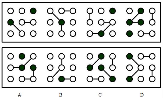 本題,觀察黑點,沒有規律。但是我們可以發現,線段的個數是在增加的,但線段條數本身不存在規律。這時我們就應該考查由線段連接在一起的黑白點的個數。題干四幅圖,每幅圖中被線段連接的黑白點的數量為4、5、6、7,依次遞增,所以問號處圖形中被連接在一起的黑白點個數應為8,滿足題意的只有C項。故選C。