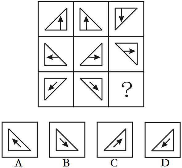 【解析】C 考查翻轉規律。第一行中各圖的規律為,第一個三角形右翻180°,得第二個三角形,第二個向下或向上翻轉180°,得第三個三角形。其他兩行也遵循同樣的規律。即“?”處的圖形為第三行的第二個圖形向上翻轉180°所得。故選C。