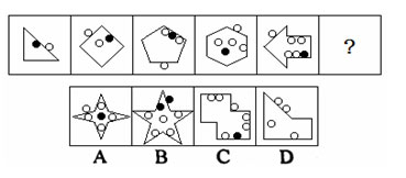 【解析】C?疾檫叺臄盗亢驮氐臄盗。每一幅圖形均由一個多邊形和小圓球組成,多邊形的邊的數量一次增加1條,每一個多邊形的外部均含有的一個白色的小圓球,內部含有的圓球總數依次增加一個,其中均含有1個黑色小圓球。因此“?”處圖形應該含有一個八邊形,其內部共有6個小圓球,其中一個為黑色的,外部含有一個小白球。故選C。