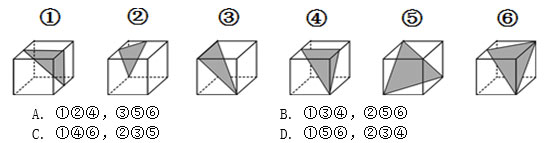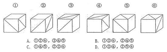 (1)觀察六個圖形,每一個圖形均為一個立方體中含有一個陰影三角形,那再根據此題的類型“圖形的分組”可知此題的關鍵在于找出幾個三角形的特點;