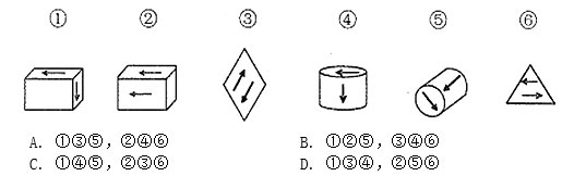 【答案】C。解析:本題考查位置關系。每一個圖形均為一個幾何體中含有兩個箭頭:單獨考慮幾何圖形,除③⑥是平面圖形外,其他四個均是立體圖形,因此按照幾何體的特性并不能將圖形分成兩組,那么本題的研究重點就是“兩個箭頭”。進一步觀察發現,①④⑤中的兩個箭頭是相互垂直的關系,②③⑥中兩個箭頭的位置是相互平行的關系。故選C。
